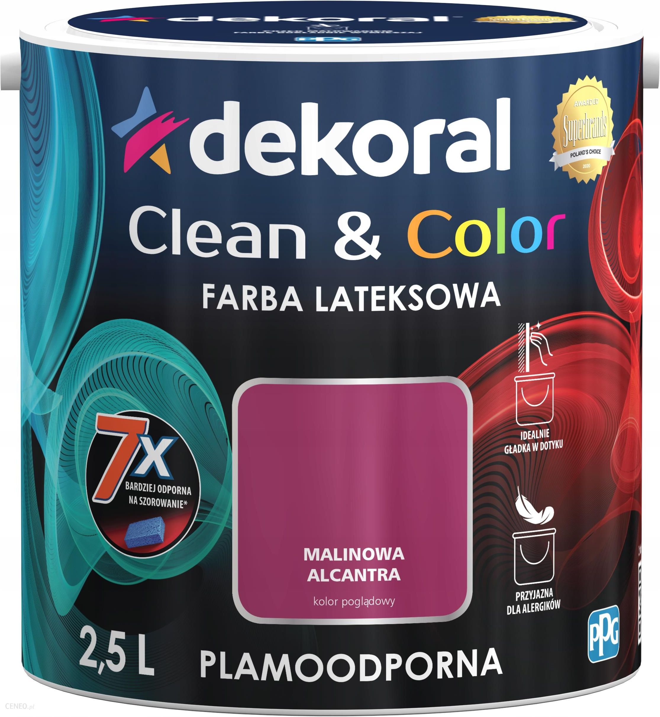 CLEAN & COLOR SATYNOWA FARBA LATEKSOWA ODPORNA NA SZOROWANIE_Pojemność: 2,5L | Wydajność: 15m2/l | Kolor: malinowa alcantra_NAJWAŻNIEJSZE CECHY:Przyjazna dla alergikówDoskonałe krycie malowanej powierzchniŁatwe zmywanie typowych plam i zabrudzeń7 x bardziej wytrzymała niż standardowe farby odporne na szorowanie wg PN-EN-13300Doskonała odporność na szorowanie – klasa 1 i 2 wg PN-EN-13300 w zależności od koloruEfekt satynowyZabrudzenia znikają, kolor zostajeIlość warstw: 2Nanoszenie drugiej warstwy: po 3hSposób nanoszenia: Pistolet, pędzel okrągły, wałek, pędzel płaskiWydajność przy jednej warstwie: do 15m2/l