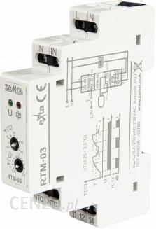 Regulator temperatury od -10 do 90 st. C, jednomodułowy, z nastawą histerezy 0,25-2 st.C TYP: RTM-03Opis produktuRegulator temperatury RTM-03 służy do sterowania odbiornikami (np. grzejniki, ogrzewanie podłogowe) w zależności od temperatury panującej w otoczeniu zewnętrznego czujnika NTC. Urządzenie posiada możliwość regulacji temperatury zadanej za pomocą potencjometru znajdującego się na panelu przednim w zakresie -10 ºC ÷ +90 ºC. Za pomocą drugiego potencjometru możliwy jest wybór jednej z 10 wartości histerezy z jaką ma działać regulator (od 0,25 ºC do 2,5 ºC). Do poprawnej pracy urządzenie wymaga podłączenia zewnętrznej sondy NTC-03. Sonda nie występuje w komplecie z regulatorem i należy nabyć ją oddzielnie. Przewód sondy ma 3 m długości i można go przedłużyć do 50 m przewodem o przekroju 0,2 ÷ 2,50 mm2. Sond nie można łączyć ze sobą.SymbolCECHY FUNKCJONALNE PRODUKTU:Regulacja temperatury w zakresie -10 ºC ÷ +90 ºC,kontrolka podłączenia czujnika,wejście nocnego obniżenia temperatury o 5 ºC,wyjście przekaźnikowe o maksymalnej obciążalności 16 A.skokowa regulacja histerezy w zakresie 0,25 ºC do 2,5 ºC,kontrolka stanu przekaźnika,obudowa jednomodułowa,zewnętrzna sonda NTC,sterowanie odbiornikami w zależności od temperatury,montaż na szynie TH 35,DANE TECHNICZNE:Zaciski zasilania L , NZnamionowe napięcie zasilania 230 VLiczba kanałów 1Parametry styków przekaźnika 16 A NO/NC 4000 VA AC1Stopień ochrony obudowy IP20Szerokość 17,5 mmWysokość 90,0 mmGłębokość 66,0 mmWaga 77 gZaciski czujnika NTC NTCZakres nastaw temperatury -10 ÷ +90 ºCZakres nastawy histerezy temperatury 0,25 ÷ 2,5 ºCZaciski wejścia nocnego obniżenia temp. o 5 stopni Celsjusza Wejścia IN wyzwalane przez sygnał L lub N