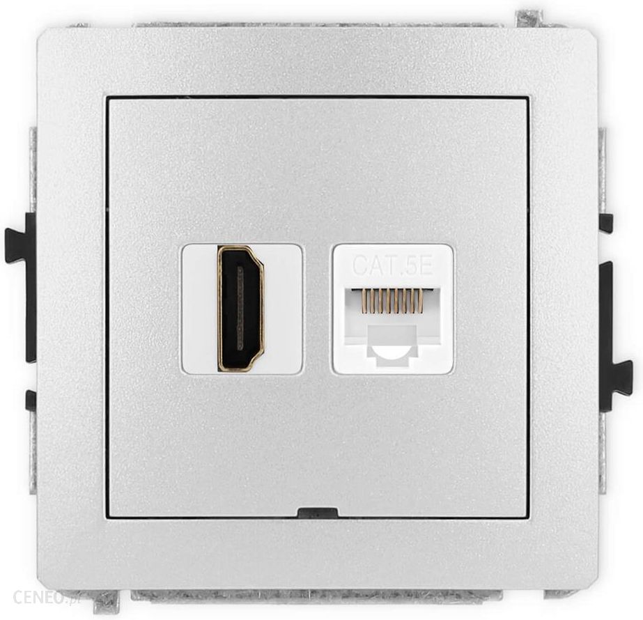 Gniazdo HDMI + komputerowe RJ45 w kolorze srebrny metalik z serii DECO, marki Karlik.Połączenie gniazda HDMI 1.4 i komputerowego kat. 5e w jednym module. Do kompletu wymagana ramka. Można stosować do systemów ramkowych wielokrotnych.Gniazdo HDMI stanowi estetyczne zakończenie przewodu HDMI poprowadzonego w ścianie, który musi być zakończony wtyczką HDMI. Gniazda HDMI służą do przesyłania cyfrowego, nieskompresowanego sygnału audio i video. Umożliwiają łączenie oddalonych od siebie sprzętów audio-video oraz komputerowych.Gniazdo komputerowe (rj45) pojedyncze przeznaczone do podłączenia jednego kabla sygnałowego kategorii 5e (UTP) typu skrętka (internet). Pod względem wydajności okablowanie kategorii 5e uznaje się obecnie za poziom podstawowy. Umożliwia ono transmisję danych zgodną ze standardem 1000 Mb/s Ethernet i sprawdza się idealnie w zastosowaniach niewymagających dużej szerokości pasma np. w domach lub małych biurach