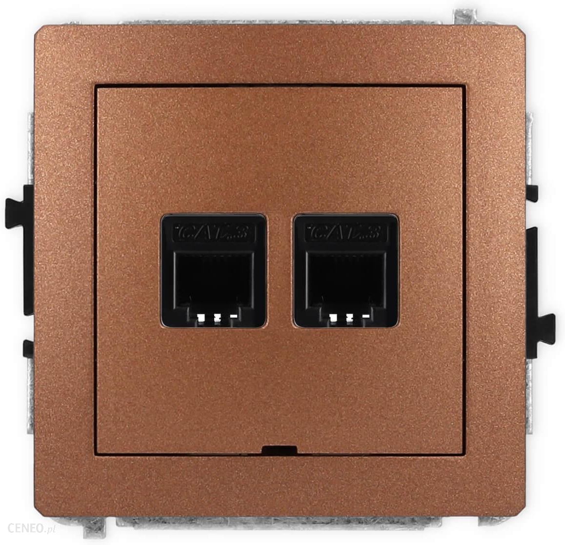 Gniazdo telefoniczne podwójne w kolorze brązowy metalik z serii DECO, marki Karlik.Gniazdo telefoniczne podwójne niezależne służy do podłączenia dwóch niezależnych linii telefonicznych. Do kompletu wymagana ramka. Można stosować do systemów ramkowych wielokrotnych.