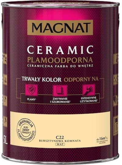 MAGNAT Ceramic to farba do ścian i sufitów, bazująca na najwyższej jakości ceramicznych komponentach, żywicach i pigmentach. Unikalna formuła gwarantuje trwałość koloru i jego odporność na plamy, zmywanie, szorowanie i intensywne użytkowanie. Farba MAGNAT Ceramic tworzy powłoki, które nie absorbują zabrudzeń i trudnych plam.Dostępne pojemności: 2.5L, 5LIlość warstw: 2Metoda aplikacji: wałek, natryskWydajność: do 16 m2/L przy jednokrotnym malowaniu