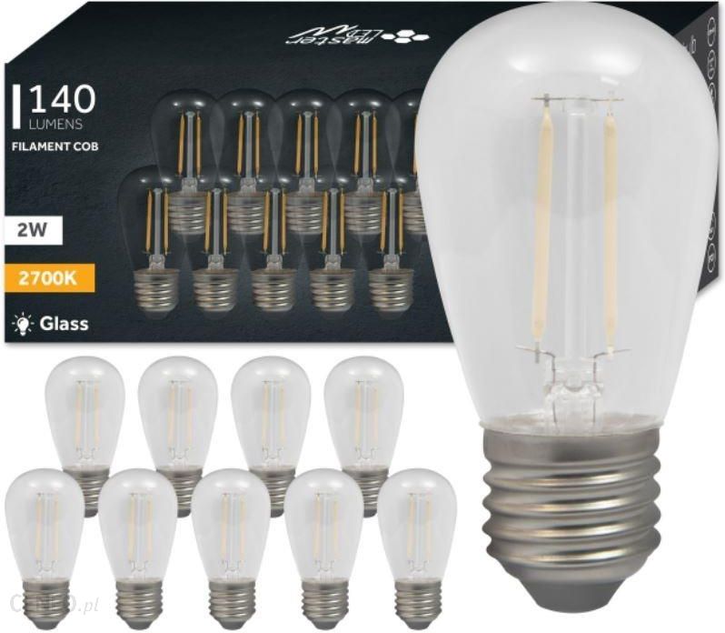 Opakowanie żarówek Filament serii Vita w stylu retro przeznaczone do girland ale idealnie sprawdzą się w klasycznie wyglądających oprawach, lampkach i lampionach. Cena za pudełko – 10 żarówek.Barwa światła biała ciepła pasuje do każdego rodzaju pomieszczeń domowych. Przez wiele lat właśnie ten typ żarówek gościł w naszych domach. Ciepła barwa wpływa na nasz organizm uspokajająco, sprzyja relaksowi, wyciszeniu oraz odpoczynku. Idealnie komponuje się z pastelamiParametry techniczne:Barwa światła: 2700K (Biały Ciepły)Typ trzonka: E27Źródło światła: Filament COBJasność: 140lmWsp. oddawania barw: RA80Napięcie wejściowe: AC220-240V 50/60HzMoc: 2WKąt świecenia: 360°Wymiary: 45 x 84 [mm]Materiał: Szkło + stalKolor szkła: PrzezroczysteKlasa odporności: IP20Klasa energetyczna: FŻarówka ma charakter ozdobny, deklarowana przez producenta barwa światła biała ciepła 2700k, żarówki idealnie sprawdzą się w girlandach, klasycznie wyglądających oprawach, lampkach i lampionach. Żarówki ledowe zostały wykonane w technologii COB LED. Nasze żarówki są przyjazne dla środowiska, nie zawierają rtęci, brak jakichkolwiek zanieczyszczeń Cechuje je najlepsza jakość, błyskawiczne zapalania, brak efektu stroboskopowego.